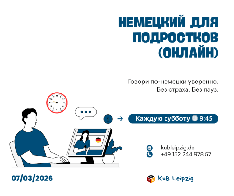 Подростковый возраст — время,когда важно не терять уверенность в школе. Немецкий становится сложнее:тексты длиннее, задания труднее,нужно уверенно говорить и отвечать. Мы помогаем подросткам:• понимать задания, а не заучивать• расширять словарный запас• уверенно говорить на немецком• спокойно справляться со школьной программой Малые группы.Понятная система обучения.Практика языка на каждом занятии. 📍 KuB Leipzig📲 +49 152 244 978 […]