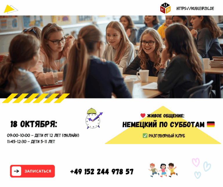 Bonjour! 👋Французский язык открывает доступ к богатой культуре, литературе и новым возможностям общения.На занятиях ученики осваивают разговорную и письменную речь, произношение и грамматику.Атмосфера обучения спокойная и доброжелательная, с вниманием к каждому ученику. 📅 Понедельник, вторник, четверг, пятница🕓 15:00 – 18:00📍 Eisenbahnstr. 99, 04315 Leipzig📲 +49 152 244 978 57 (WhatsApp, Telegram)🌐 kubleipzig.de/schedule-sign-up/— можно записаться через […]