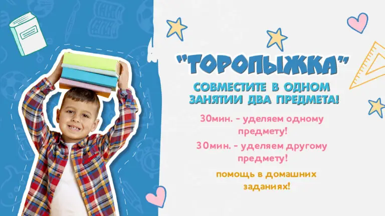 Ihr Kind ist sehr aktiv oder Sie haben einen vollen Terminkalender? Und die Hausaufgaben rauben Ihnen die gemeinsame Familienzeit? Wir bieten Ihnen unser einzigartiges Programm „Torpyschka“ an! Kombinieren Sie zwei wichtige Schulfächer in einer Unterrichtseinheit!Nach Ihren Wünschen verbinden wir gezielt zwei besonders wichtige Fächer in einer Stunde – und helfen dabei, schulische Lücken bei Ihrem