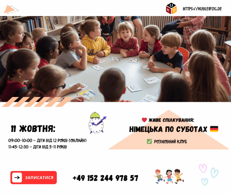 Запрошуємо на заняття з розмовної німецької 👧🗣Практикуємо живе спілкування, розширюємо словниковий запас і вчимося говорити впевнено та правильно. 📅 18 жовтня (субота)🕘 09:00–10:00 — діти від 12 років (онлайн)🕦 11:45–12:30 — діти 5–11 років 📍 Eisenbahnstr. 99, 04315 Leipzig📲 +49 152 244 978 57 (WhatsApp, Telegram)🌐 kubleipzig.de