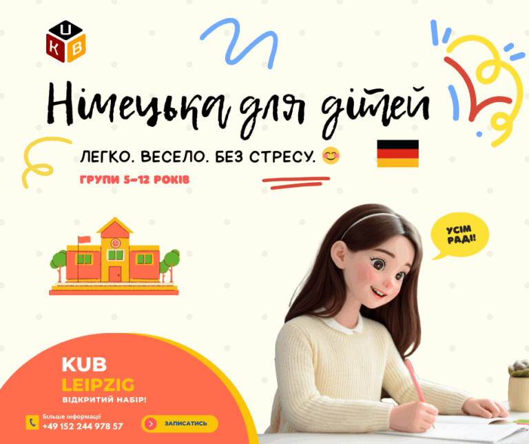 👶📚 Запрошуємо дітей у підготовчу групу з німецької мови.Вчимося розуміти, говорити та готуємося до школи. 🕒 Заняття проходять у пн, вт, ср о 16:30 📲 Запис: 0152 244 97857