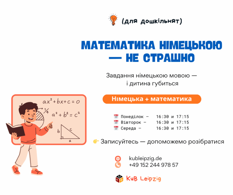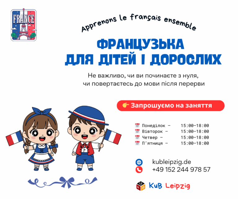 Французька мова здається красивою, але складною? Почати говорити можна спокійно та без стресу —у будь-якому віці. Заняття з французької мови для дітей і дорослих — це:• зрозумілі пояснення• жива мовна практика• підтримка на кожному етапі• комфортна атмосфера Не важливо, чи ви починаєте з нуля,чи повертаєтесь до мови після перерви. 👉 Запрошуємо на заняття📍 KuB Leipzig📲 […]