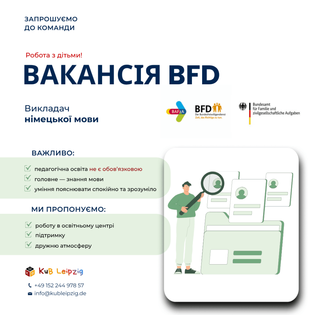 Це федеральна волонтерська служба в Німеччині. Ви отримуєте досвід, підтримку та невелику винагороду, допомагаючи дітям адаптуватися до німецької мови.